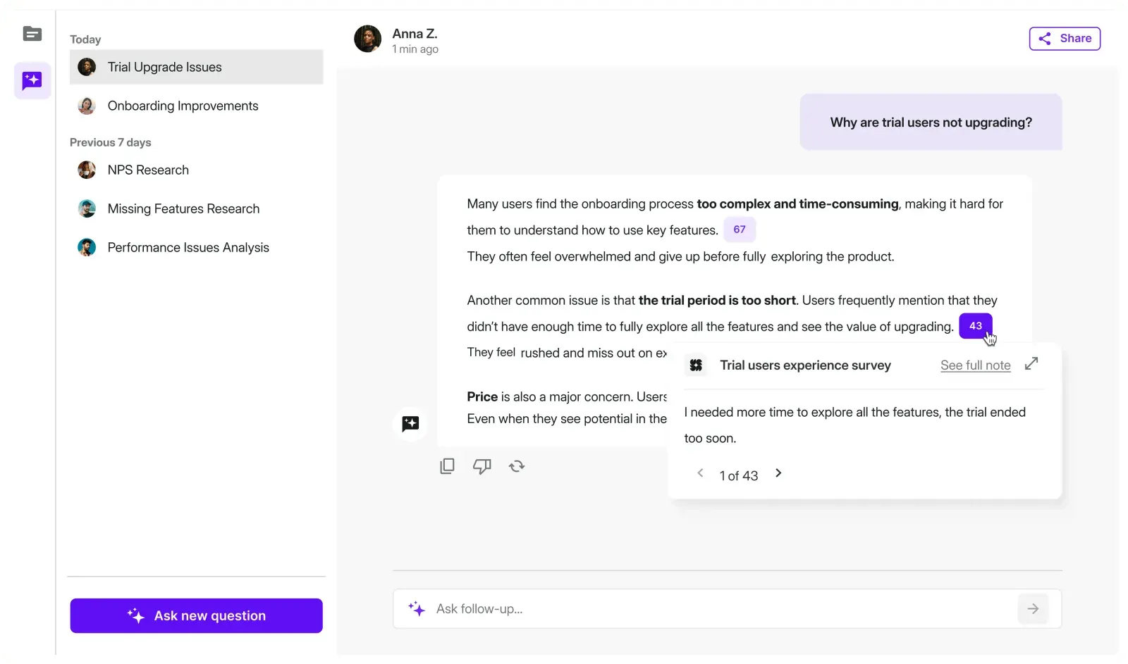 - AI Chat (Your Research Mastermind): Have questions about your customer feedback? Just ask! The AI chat feature acts like your personal research assistant, providing instant answers and insights based on your data. 💬